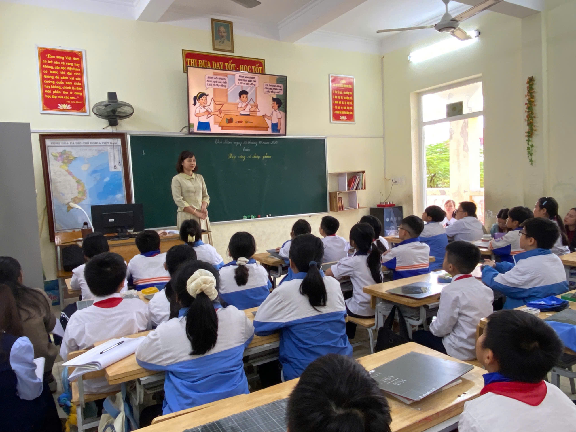Sau khi tổ khối thảo luận và thống nhất xây dựng Kế hoạch bài dạy "Phép cộng số thập phân (Tiết 1)"; phân công lên tiết dạy: đ/c Hoàng Thu Huyền; các đồng chí trong khối hỗ trợ. Ngày 23/10, toàn trường tham gia dự giờ và thảo luận, thống nhất chung. Tiết học đáp ứng được yêu cầu của chuyên đề, HS được phát triển năng lực tự học và giải quyết vấn đề. GV ứng dụng được AI qua đó phát huy năng lực tự chủ cho HS, HS hứng thú qua phần mềm Beeclass. Tiết dạy đảm bảo đúng mục đích chuyên đề, phát huy được tính tích cực của học sinh. GV đã nêu được tình huống có vấn đề để thúc đẩy học sinh biết tìm tòi khám phá và huy động kiến thức vốn có để giải quyết vấn đề mới. Sau chuyên đề, các lớp khối 5 đã nghiên cứu, vận dụng xây dựng kế hoạch bài dạy sát với nội dung, linh hoạt các hình thức tổ chức dạy học vào đối tượng lớp của mình để đạt hiệu quả tốt nhất.