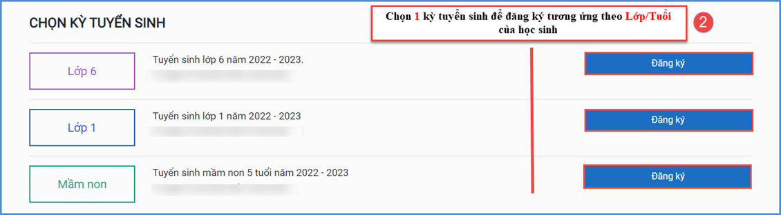 Chọn [Đăng ký tuyển sinh], giao diện hiển thị các kỳ tuyển sinh, PHHS chọn kỳ tuyển sinh cần đăng ký, nhấn nút [Đăng Ký].