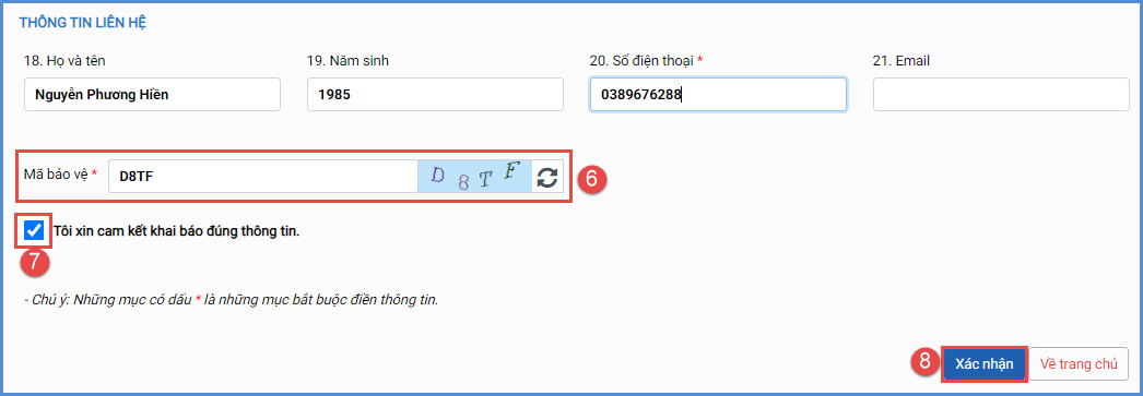 Sau khi hoàn thiện hồ sơ học sinh, PHHS nhập Mã bảo vệ, tích Cam kết khai báo đúng thông tin và [Xác nhận] để gửi hồ sơ của học sinh về trường đăng ký tuyển sinh.