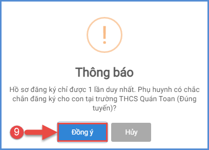 Bước 6: Hệ thống đưa ra thông báo, PHHS xác nhận [Đồng ý] để hoàn thành thao tác đăng ký tuyển sinh.