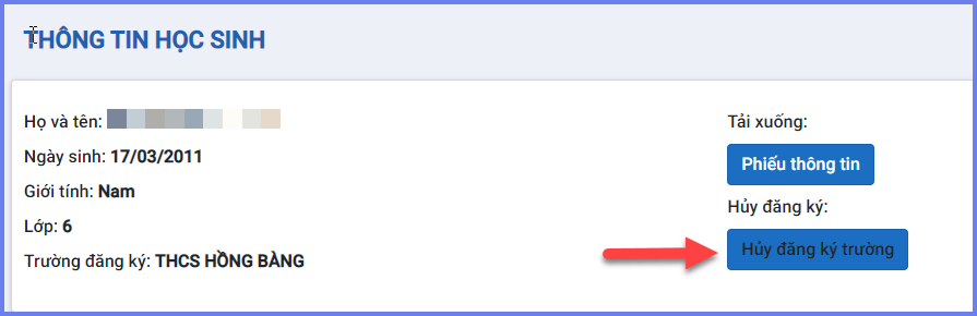 Bước 2: Giao diện tra cứu hiển thị thông tin đăng ký, PHHS chọn [Hủy đăng ký trường] sau đó thực hiện thao tác đăng ký mới tương tự phần hướng dẫn đăng ký.