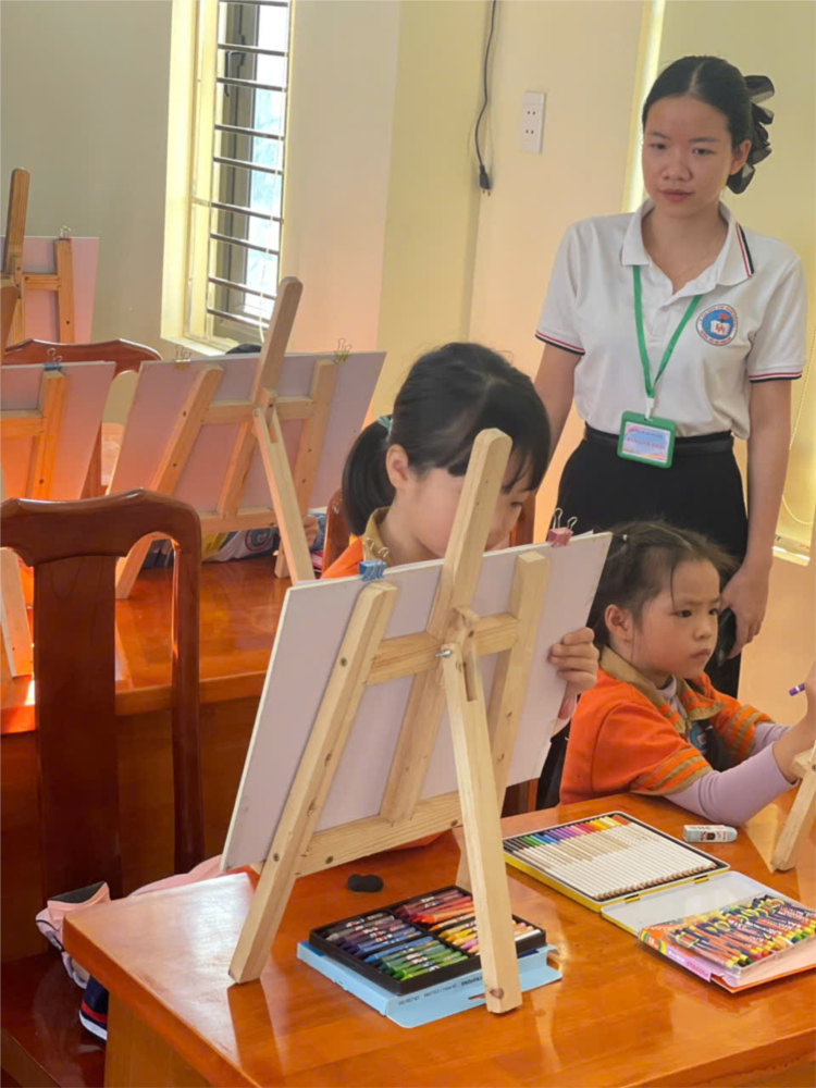 Các em học sinh lớp 1A3 đã say mê tô vẽ bằng tất cả tình cảm hồn nhiên và sáng tạo của mình. Những bức tranh rực rỡ sắc màu đã tái hiện hình ảnh thầy cô tận tụy, bạn bè vui đùa dưới sân trường, lớp học thân quen… Mỗi tác phẩm là một thông điệp ý nghĩa, thể hiện tình yêu, niềm tự hào của các em về ngôi trường Đồng Hòa.