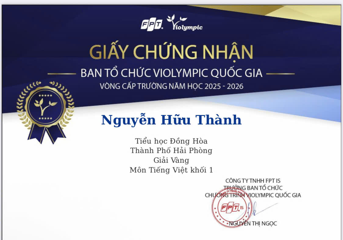 Với niềm vui và sự tự hào, giáo viên chủ nhiệm lớp 1A3 xin trân trọng thông báo: em Vũ Hữu Thành, học sinh lớp 1A3 trường Tiểu học Đồng Hòa, đã xuất sắc đạt Giải Vàng môn Tiếng Việt và Giải Bạc môn Toán trong cuộc thi trực tuyến Violympic cấp trường. Thành tích đáng khích lệ này thể hiện sự chăm chỉ, tinh thần tự giác học tập và niềm say mê học hỏi của em. Đây không chỉ là niềm tự hào của riêng em và gia đình mà còn là tấm gương sáng để các bạn học sinh lớp 1A3 noi theo, góp phần lan tỏa phong trào học tập tích cực trong nhà trường.