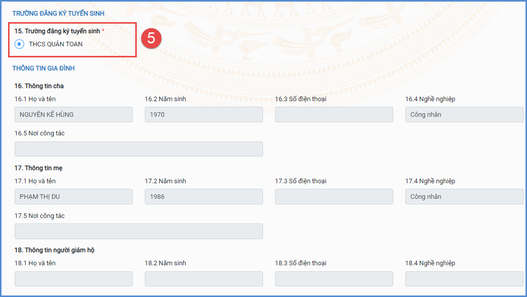 Bước 3: Phụ huynh nhập đầy đủ, chính xác thông tin của học sinh vào Phiếu thông tin học sinh.