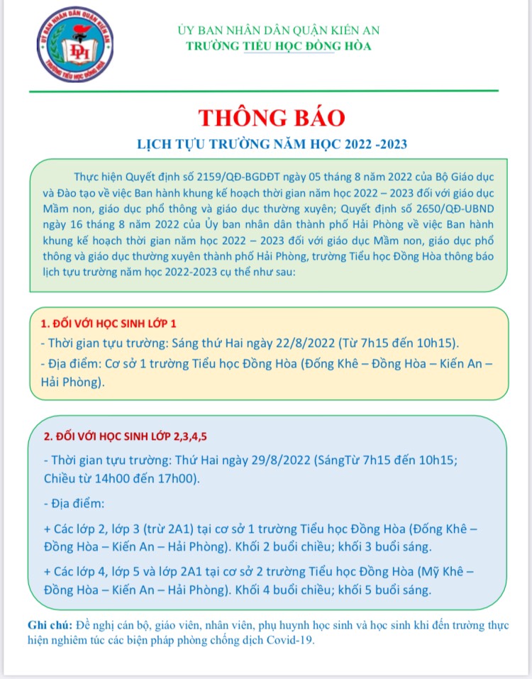 Thực hiện Quyết định số 2159/QĐ-BGDĐT ngày 05 tháng 8 năm 2022 của Bộ Giáo dục và Đào tạo về việc Ban hành khung kế hoạch thời gian năm học 2022 – 2023 đối với giáo dục Mầm non, giáo dục phổ thông và giáo dục thường xuyên; Quyết định số 2650/QĐ-UBND ngày 16 tháng 8 năm 2022 của Ủy ban nhân dân thành phố Hải Phòng về việc Ban hành khung kế hoạch thời gian năm học 2022 – 2023 đối với giáo dục Mầm non, giáo dục phổ thông và giáo dục thường xuyên thành phố Hải Phòng, trường Tiểu học Đồng Hòa thông báo lịch tựu trường năm học 2022-2023 cụ thể như sau: